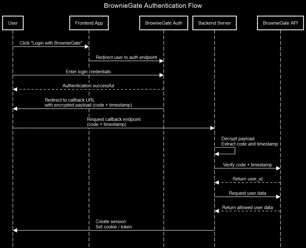 BrownieGate acts as an authentication server and SSO provider. Typical flow: